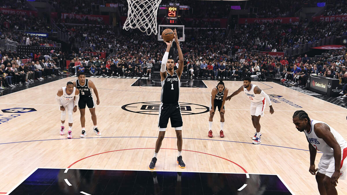 Victor Wembanyama #1 of the San Antonio Spurs shoots a foul shot against the Los Angeles Clippers during the first half of the game at Crypto.com Arena on October 29, 2023 in Los Angeles, California. Photo: Kevork Djansezian / Getty Images Sport / Getty Images
