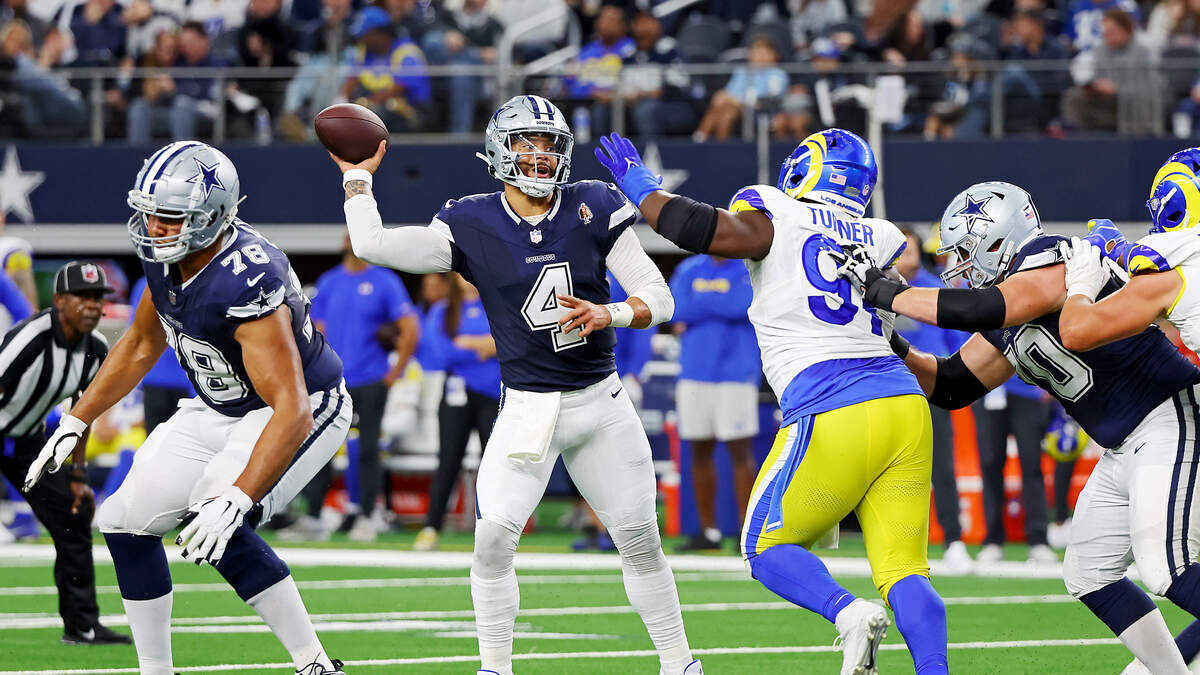 Dak Prescott #4 of the Dallas Cowboys throws a pass during the first half of a game against the Los Angeles Rams at AT&T Stadium on October 29, 2023 in Arlington, Texas. Photo: Richard Rodriguez / Getty Images Sport / Getty Images
