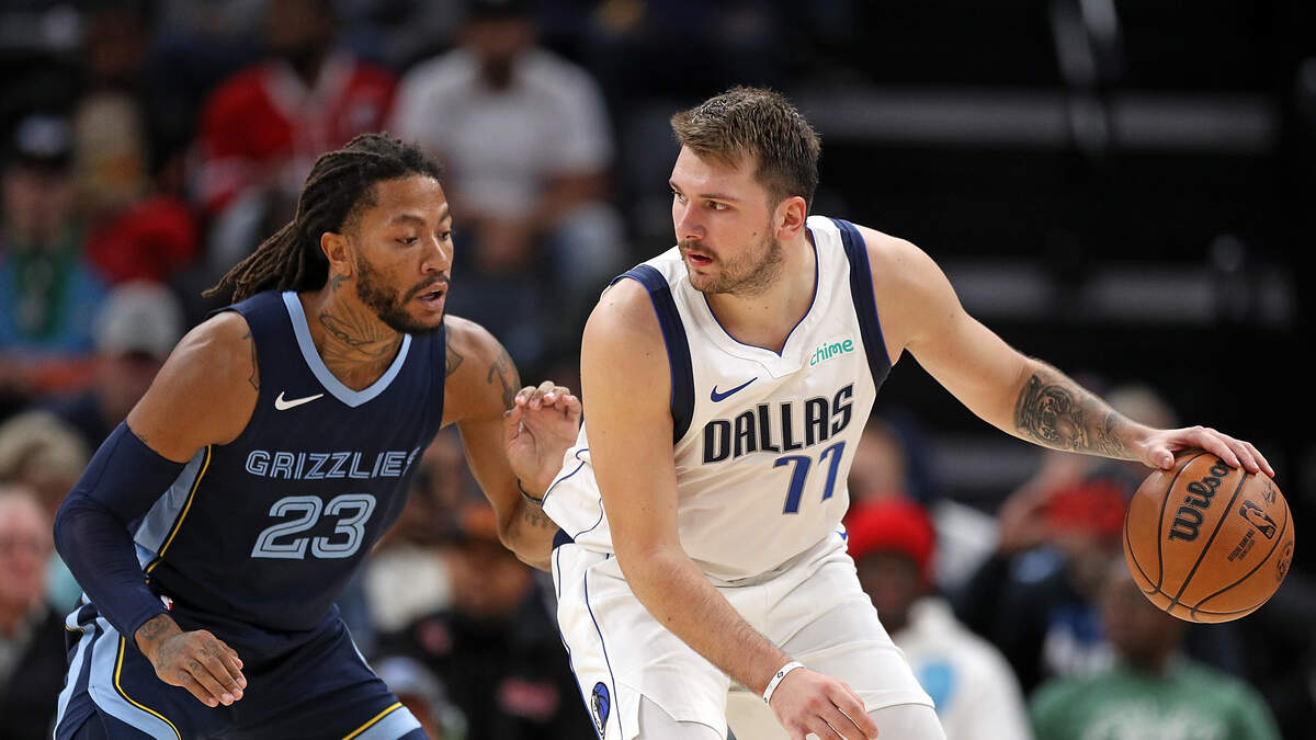 Luka Doncic #77 of the Dallas Mavericks handles the ball against Derrick Rose #23 of the Memphis Grizzlies during the second half at FedExForum on October 30, 2023 in Memphis, Tennessee. Photo: Justin Ford / Getty Images Sport / Getty Images