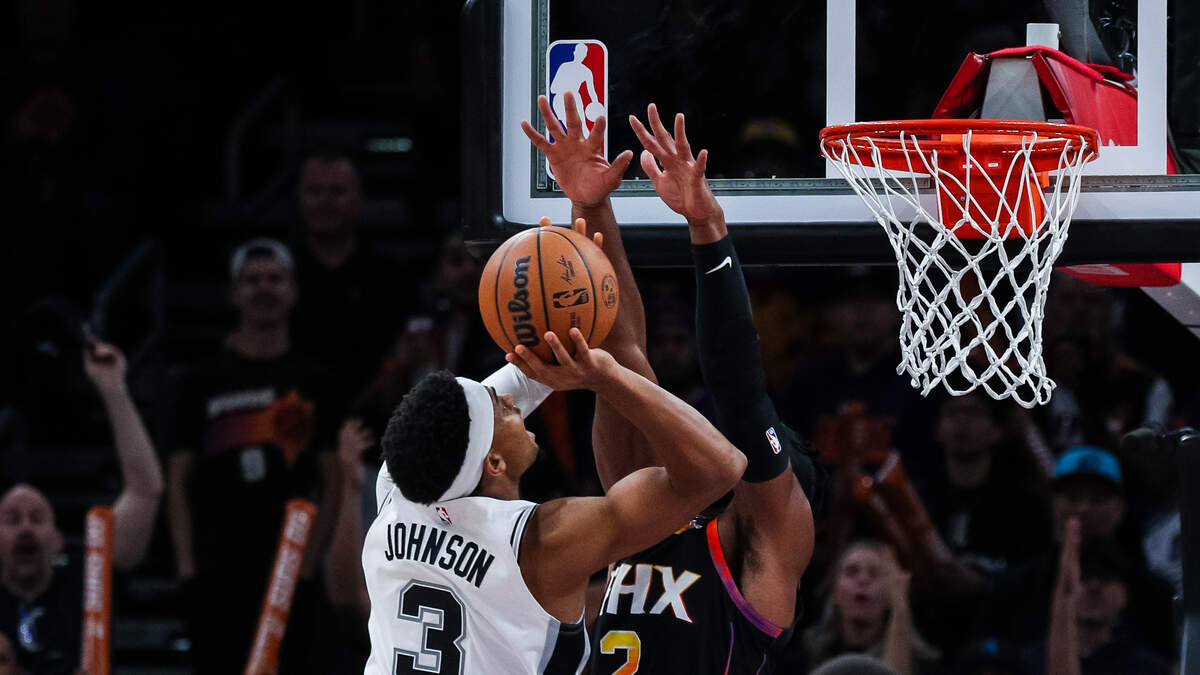 Keldon Johnson #3 of the San Antonio Spurs puts up the game-winning points over Josh Okogie #2 of the Phoenix Suns with seconds remaining during the fourth quarter of an NBA game at Footprint Center on October 31, 2023 in Phoenix, Arizona. Photo: Mike Christy / Getty Images Sport / Getty Images