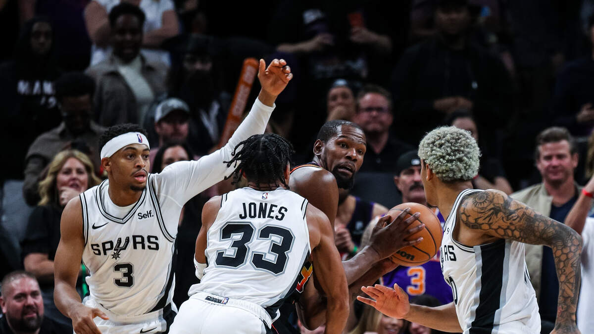 Kevin Durant #35 of the Phoenix Suns is swarmed by the defense of Keldon Johnson #3, Tre Jones #33 and Jeremy Sochan #10 of the San Antonio Spurs late in the fourth quarter of an NBA game at Footprint Center on October 31, 2023 in Phoenix, Arizona. Photo: Mike Christy / Getty Images Sport / Getty Images