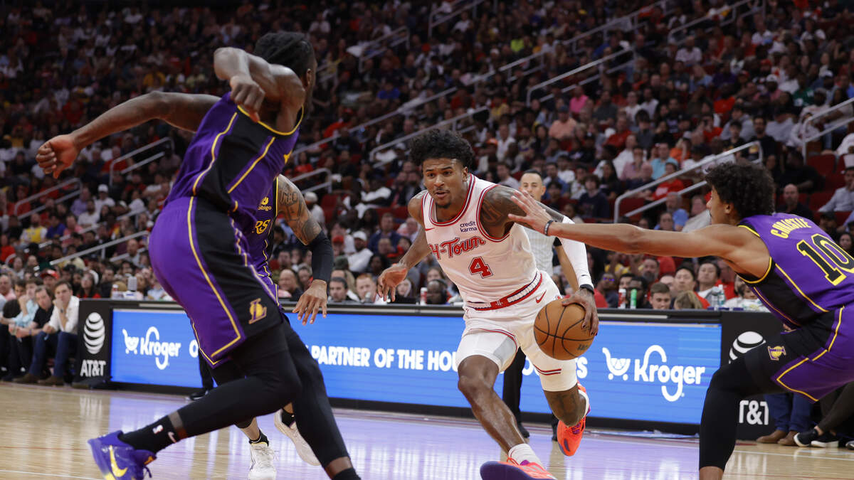 Jalen Green #4 of the Houston Rockets drives past Max Christie #10 of the Los Angeles Lakers during the second half at Toyota Center on November 08, 2023 in Houston, Texas. Photo: Carmen Mandato / Getty Images Sport / Getty Images