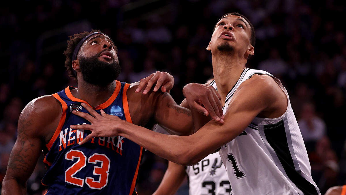 Victor Wembanyama #1 of the San Antonio Spurs and Mitchell Robinson #23 of the New York Knicks look for the ball during the fourth quarter in the game at Madison Square Garden on November 08, 2023 in New York City. Photo: Elsa / Getty Images Sport / Getty Images