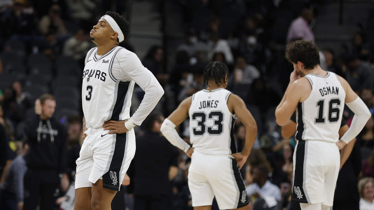 1 of 1 Keldon Johnson #3 of the San Antonio Spurs walks away after losing to the Memphis Grizzlies at Frost Bank Center on November 18, 2023 in San Antonio, Texas. Photo: Ronald Cortes / Getty Images Sport / Getty Images