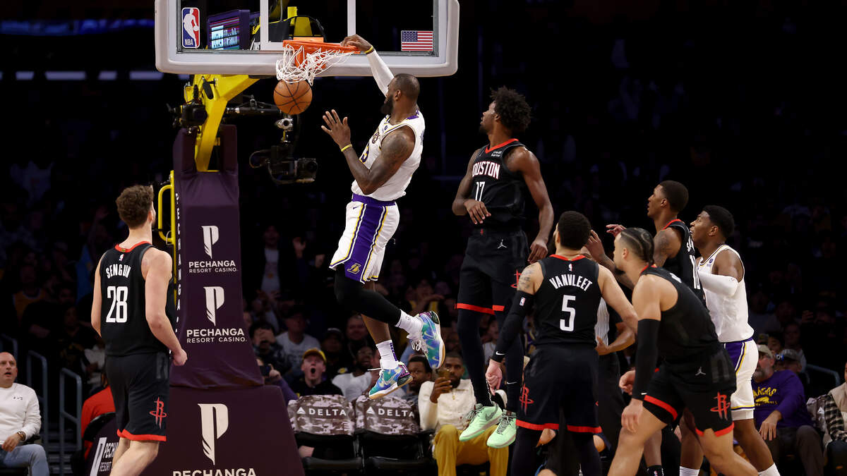 LeBron James #23 of the Los Angeles Lakers dunks the ball against Jabari Smith Jr. #10, Tari Eason #17, Fred VanVleet #5, Dillon Brooks #9 and Alperen Sengun #28 of the Houston Rockets during the fourth quarter at Crypto.com Arena on November 19, 2023 in Los Angeles, California. Photo: Katelyn Mulcahy / Getty Images Sport / Getty Images
