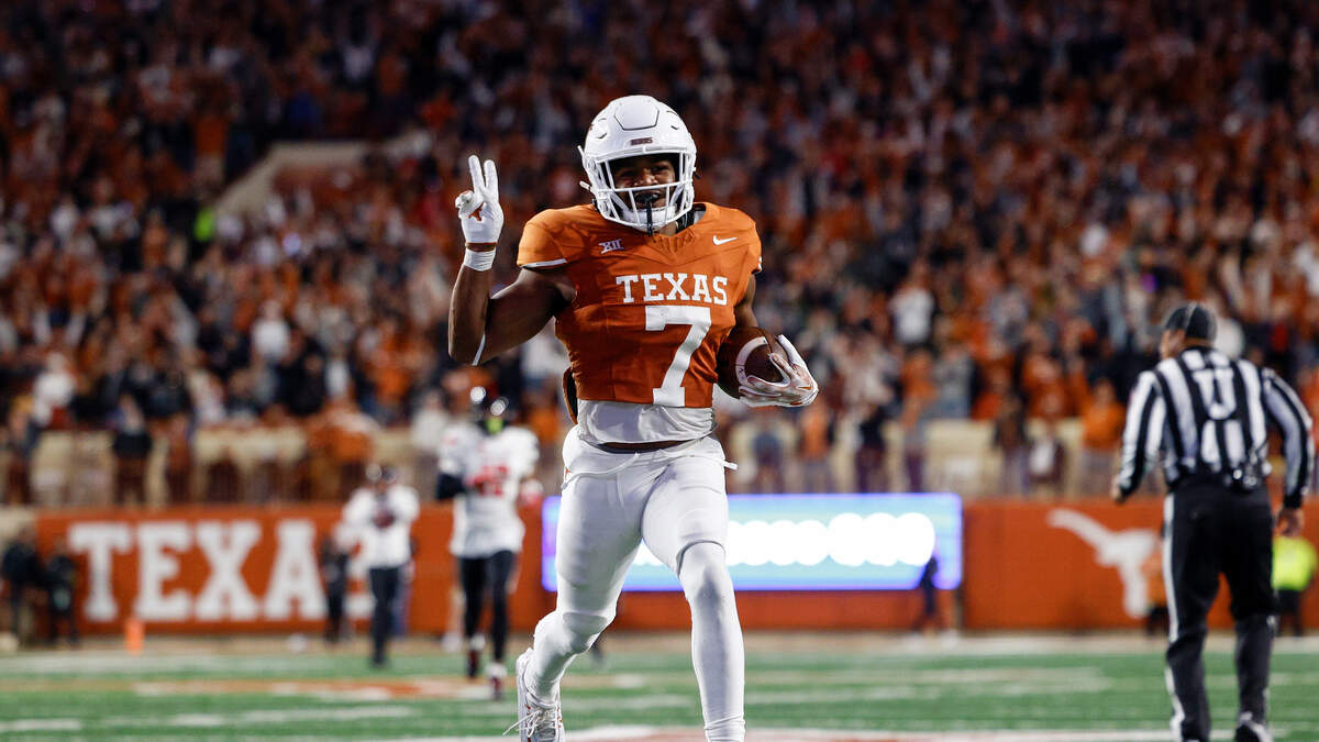 Keilan Robinson #7 of the Texas Longhorns returns a kickoff for a touchdown in the third quarter against the Texas Tech Red Raiders at Darrell K Royal-Texas Memorial Stadium on November 24, 2023 in Austin, Texas. Photo: Tim Warner / Getty Images Sport / Getty Images