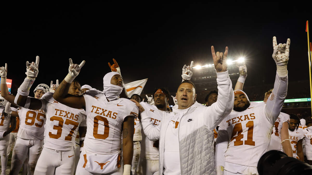 Steve Sarkisian head coach of the Texas Longhorns celebrates with his team and Texas Longhorns fans after winning 26-16 over the Iowa State Cyclones at Jack Trice Stadium on November 18, 2023 in Ames, Iowa. Photo: David Purdy / Getty Images Sport / Getty Images