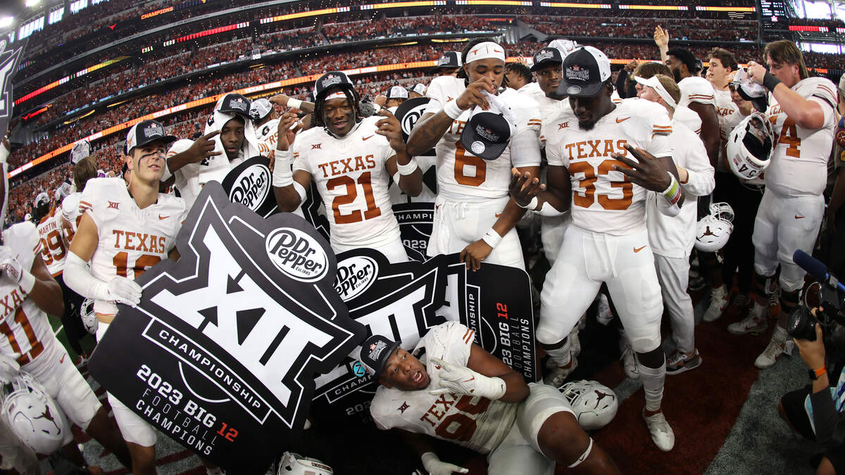 1 of 9 The Texas Longhorns Celebrate after defeating the Oklahoma State Cowboys in the Big 12 Championship at AT&T Stadium on December 2, 2023 in Arlington, Texas. (Photo by Ron Jenkins/Getty Images)Photo: Ron Jenkins / Getty Images Sport / Getty Images