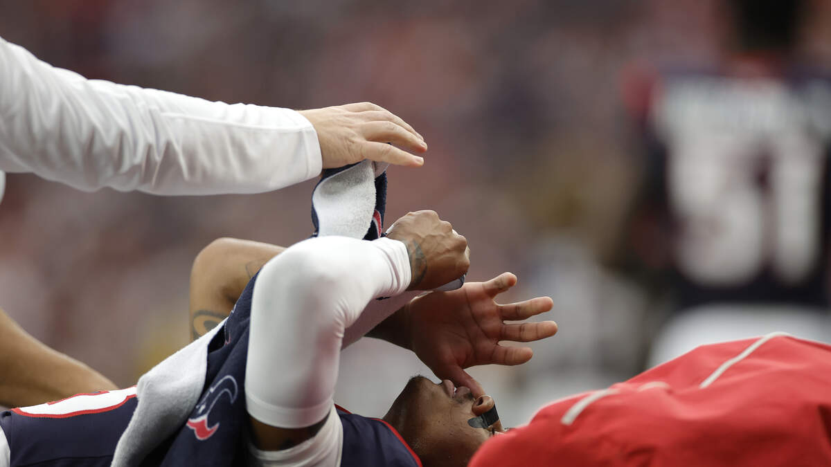 Tank Dell #3 of the Houston Texans is carted off the field after being injured in the first quarter against the Denver Broncos at NRG Stadium on December 03, 2023 in Houston, Texas. Photo: Carmen Mandato / Getty Images Sport / Getty Images