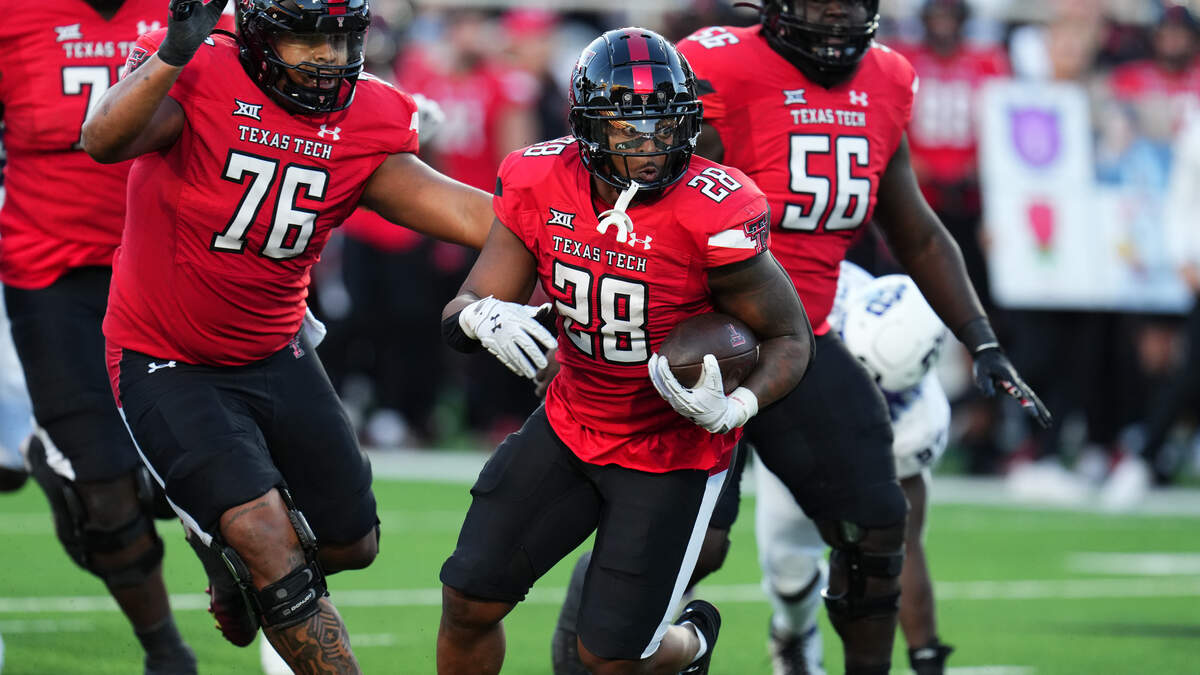 Tahj Brooks #28 of the Texas Tech Red Raiders rushes during the first quarter against the TCU Horned Frogs at Jones AT&T Stadium on November 02, 2023 in Lubbock, Texas.Photo: Josh Hedges / Getty Images Sport / Getty Images