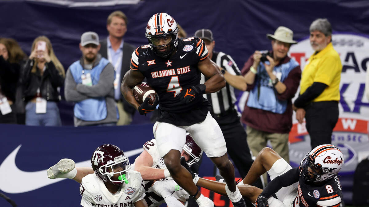 Nickolas Martin #4 of the Oklahoma State Cowboys reacts after recovering a fumble in the fourth quarter against the Texas A&M Aggies during the TaxAct Texas Bowl at NRG Stadium on December 27, 2023 in Houston, Texas. Photo: Tim Warner / Getty Images Sport / Getty Images