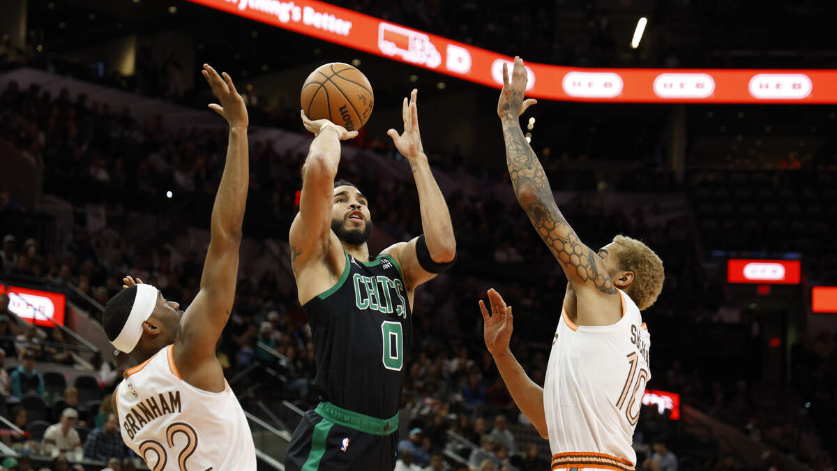 Jayson Tatum #0 of the Boston Celtics shoots over Malaki Branham #22 (L) and Jeremy Sochan #10 of the San Antonio Spurs in the first half at Frost Bank Center on December 31, 2023 in San Antonio, Texas. Photo: Ronald Cortes / Getty Images Sport / Getty Images