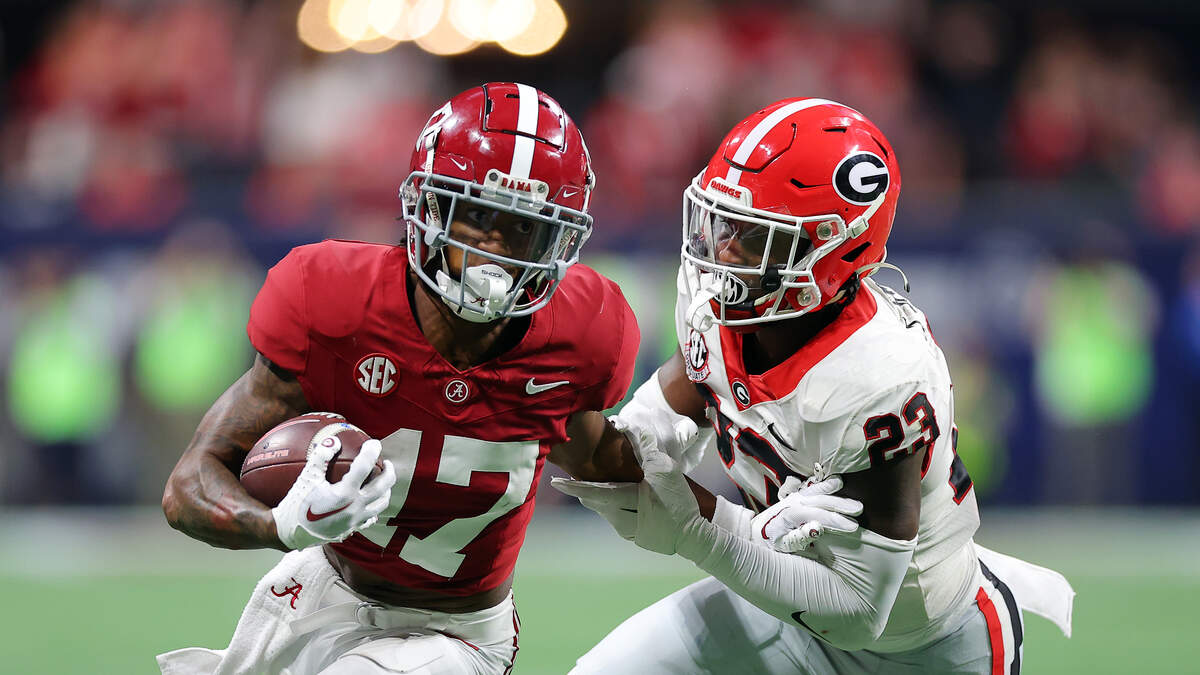 Isaiah Bond #17 of the Alabama Crimson Tide makes a catch against Tykee Smith #23 of the Georgia Bulldogs during the fourth quarter in the SEC Championship at Mercedes-Benz Stadium on December 02, 2023 in Atlanta, Georgia. (Photo by Kevin C. Cox/Getty Images)Photo: Kevin C. Cox / Getty Images Sport / Getty Images