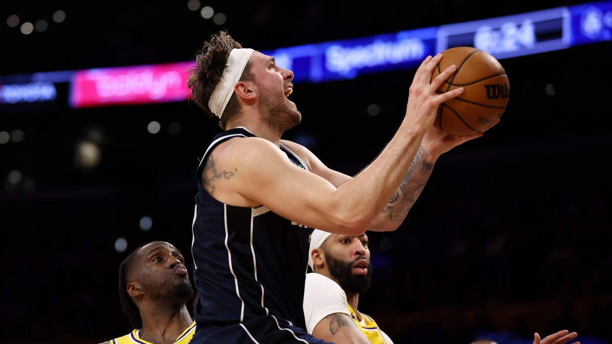 Luka Doncic #77 of the Dallas Mavericks drives to the basket against Anthony Davis #3 and Taurean Prince #12 of the Los Angeles Lakers during the second quarter at Crypto.com Arena on January 17, 2024 in Los Angeles, California. Photo: Katelyn Mulcahy / Getty Images Sport / Getty Images