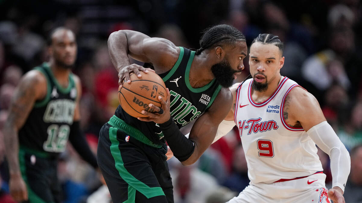 Jaylen Brown #7 of the Boston Celtics holds the ball as Dillon Brooks #9 of the Houston Rockets defends during the third quarter of the game at Toyota Center on January 21, 2024 in Houston, Texas. Photo: Alex Bierens de Haan / Getty Images Sport / Getty Images