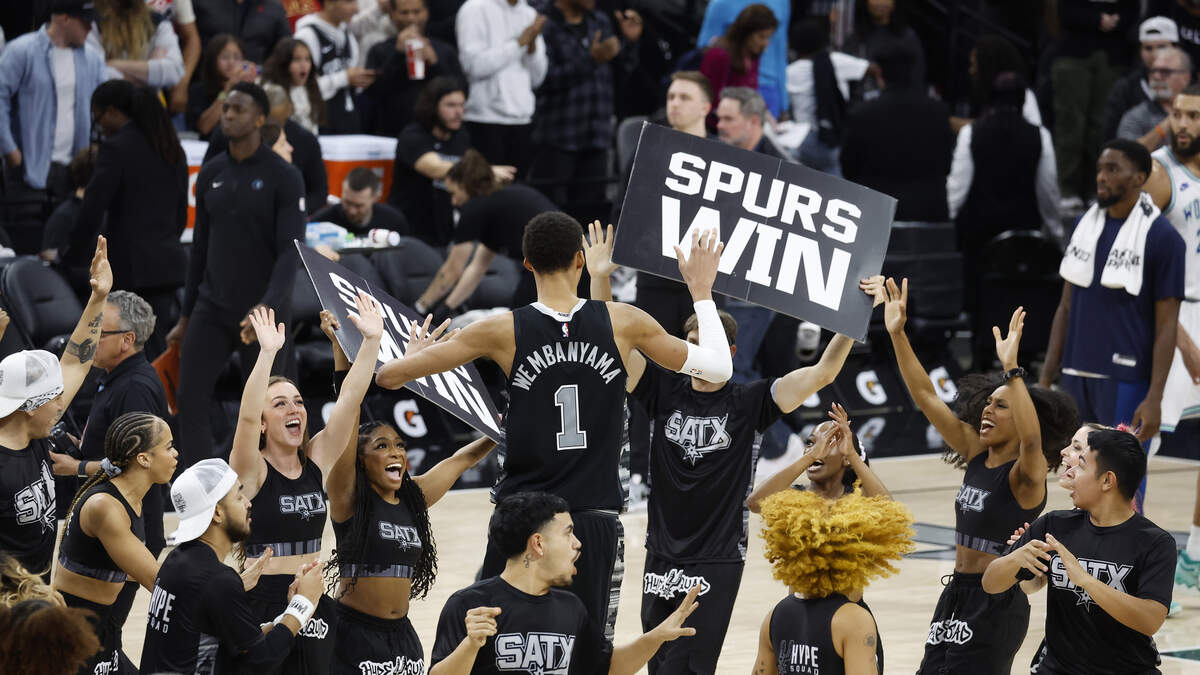 Victor Wembanyama #1 of the San Antonio Spurs celebrates their victory over the Minnesota Timberwolves in the first half at Frost Bank Center on January 27, 2024 in San Antonio, Texas. Photo: Ronald Cortes / Getty Images Sport / Getty Images