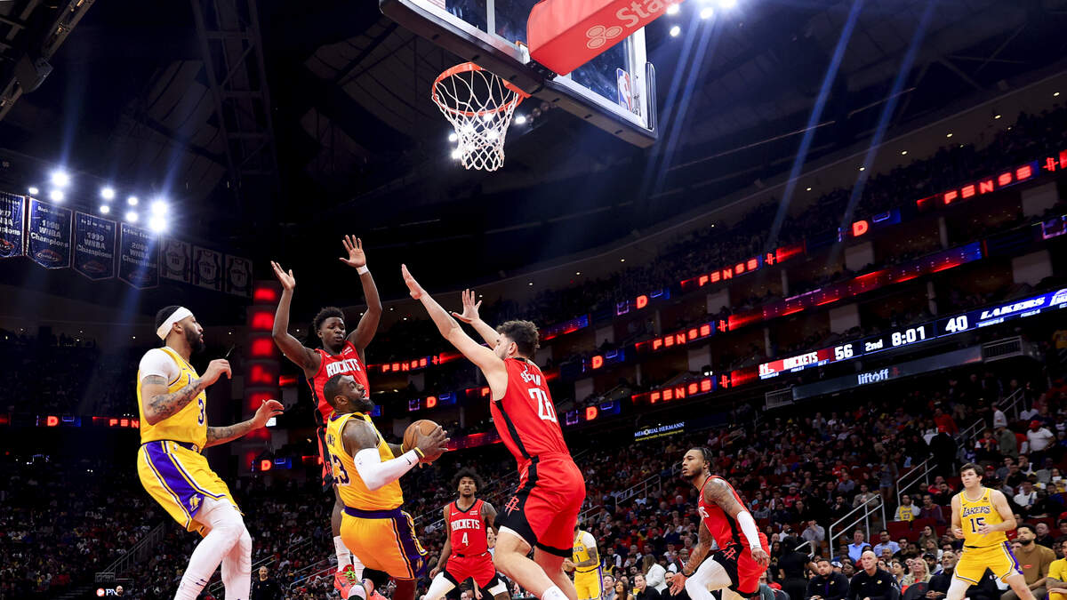 LeBron James #23 of the Los Angeles Lakers is fouled on the play by Alperen Sengun #28 of the Houston Rockets during the first half at Toyota Center on January 29, 2024 in Houston, Texas. Photo: Carmen Mandato / Getty Images Sport / Getty Images