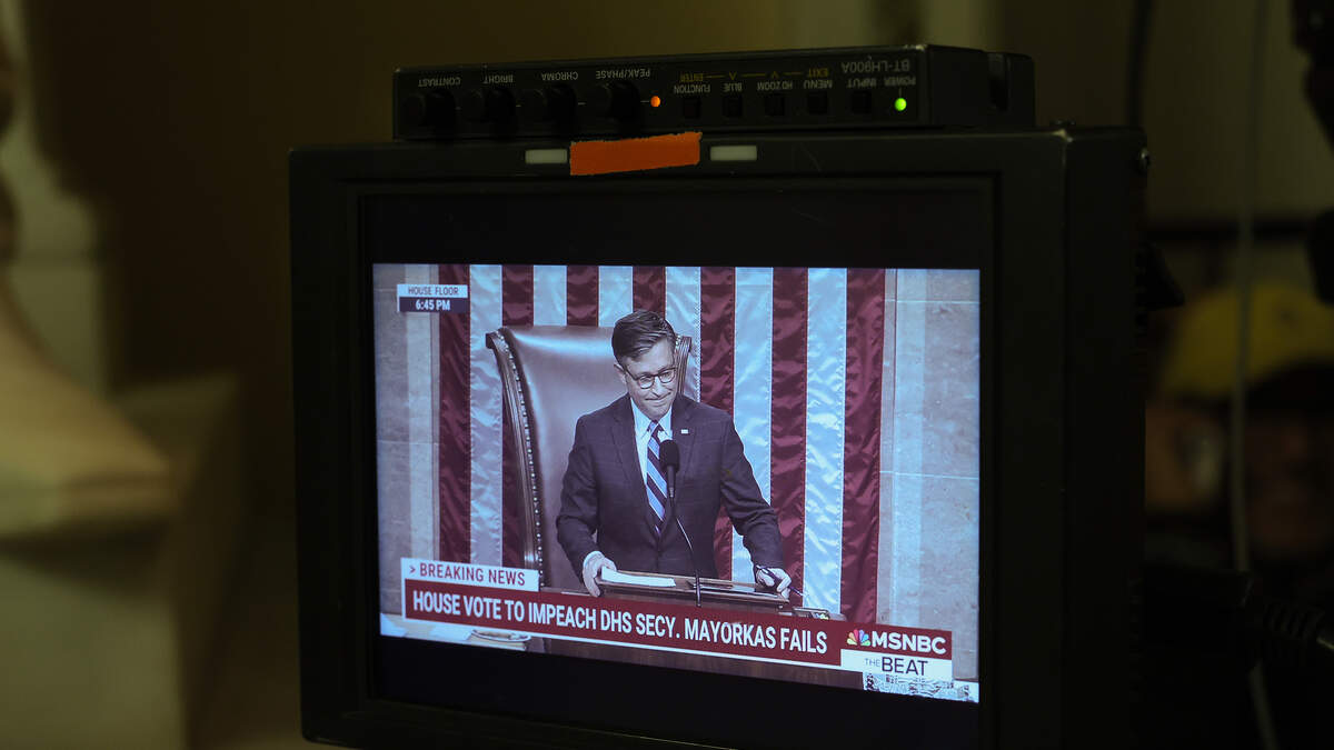 U.S. Speaker of the House Mike Johnson (R-LA) is seen on a television screen outside of the House Chamber as the House of Representatives holds a vote to impeach Homeland Security Secretary Alejandro Mayorkas at the U.S. Capitol on February 06, 2024 in Washington, DC. Photo: Kevin Dietsch / Getty Images News / Getty Images