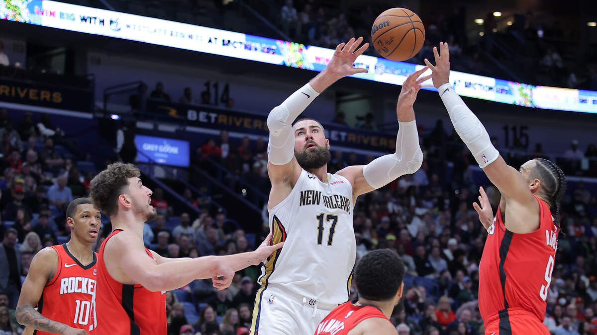 Jonas Valanciunas #17 of the New Orleans Pelicans passes the ball during the second half against the Houston Rockets at the Smoothie King Center on February 22, 2024 in New Orleans, Louisiana.Photo: Jonathan Bachman / Getty Images Sport / Getty Images