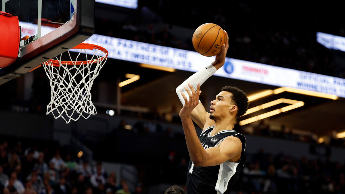Victor Wembanyama #1 of the San Antonio Spurs dunks the ball against the Minnesota Timberwolves in the fourth quarter at Target Center on February 27, 2024 in Minneapolis, Minnesota. Photo: David Berding / Getty Images Sport / Getty Images