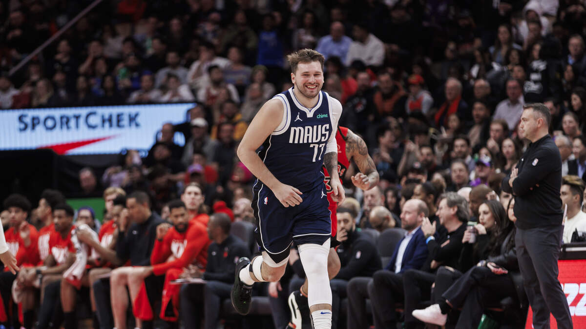 Luka Doncic #77 of the Dallas Mavericks smiles as he runs back on defense against the Toronto Raptors in the second half of their NBA game at Scotiabank Arena on February 28, 2024 in Toronto, Canada.Photo: Cole Burston / Getty Images Sport / Getty Images