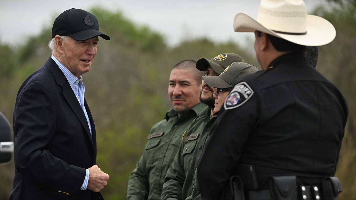 US President Joe Biden (L) speaks with US Border Patrol agents as he visits the US-Mexico border in Brownsville, Texas, on February 29, 2024. Photo: JIM WATSON / AFP / Getty Images