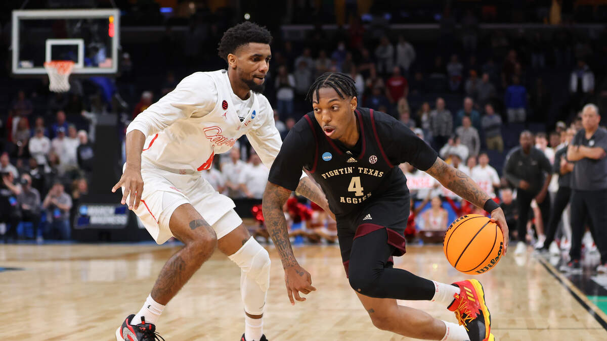 Wade Taylor IV #4 of the Texas A&M Aggies drives to the basket against Mylik Wilson #8 of the Houston Cougars during overtime in the second round of the NCAA Men's Basketball Tournament at FedExForum on March 24, 2024 in Memphis, Tennessee. Photo: Stacy Revere / Getty Images Sport / Getty Images