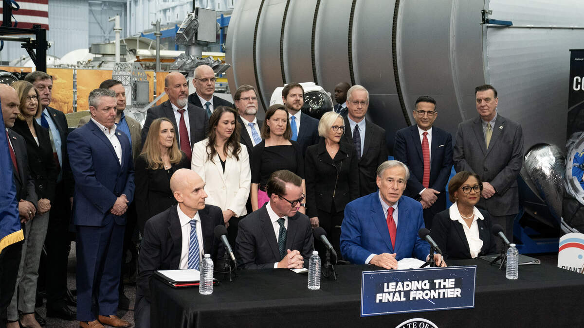 (L-R) Seated at table, Texas State Representative, Greg Bonnen; Speaker of the Texas House of Representatives, Dade Phelan; Texas Governor Abbott and NASA Johnson Space Center Director, Vanessa Wyche, attend a press conference regarding the future of the space industry in Texas, at NASA's Johnson Space Center in Houston, Texas, on March 26, 2024. Photo: SUZANNE CORDEIRO / AFP / Getty Images