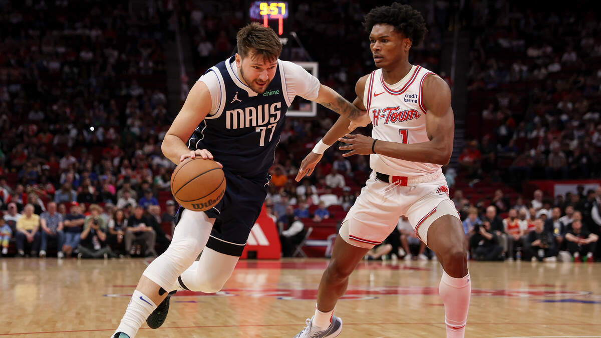 Luka Doncic #77 of the Dallas Mavericks drives to the basket while defended by Amen Thompson #1 of the Houston Rockets in the first half at Toyota Center on March 31, 2024 in Houston, Texas. Photo: Tim Warner / Getty Images Sport / Getty Images