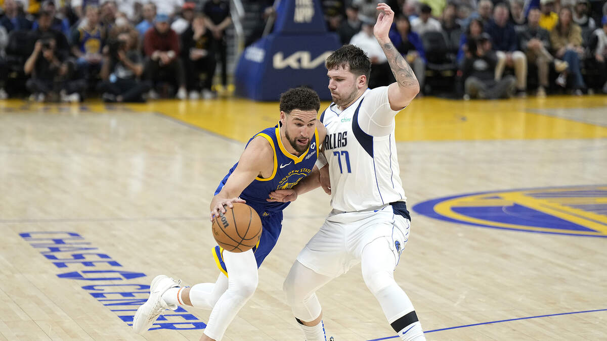 Klay Thompson #11 of the Golden State Warriors is guarded by Luka Doncic #77 of the Dallas Mavericks during the second half at Chase Center on April 02, 2024 in San Francisco, California. Photo: Thearon W. Henderson / Getty Images Sport / Getty Images