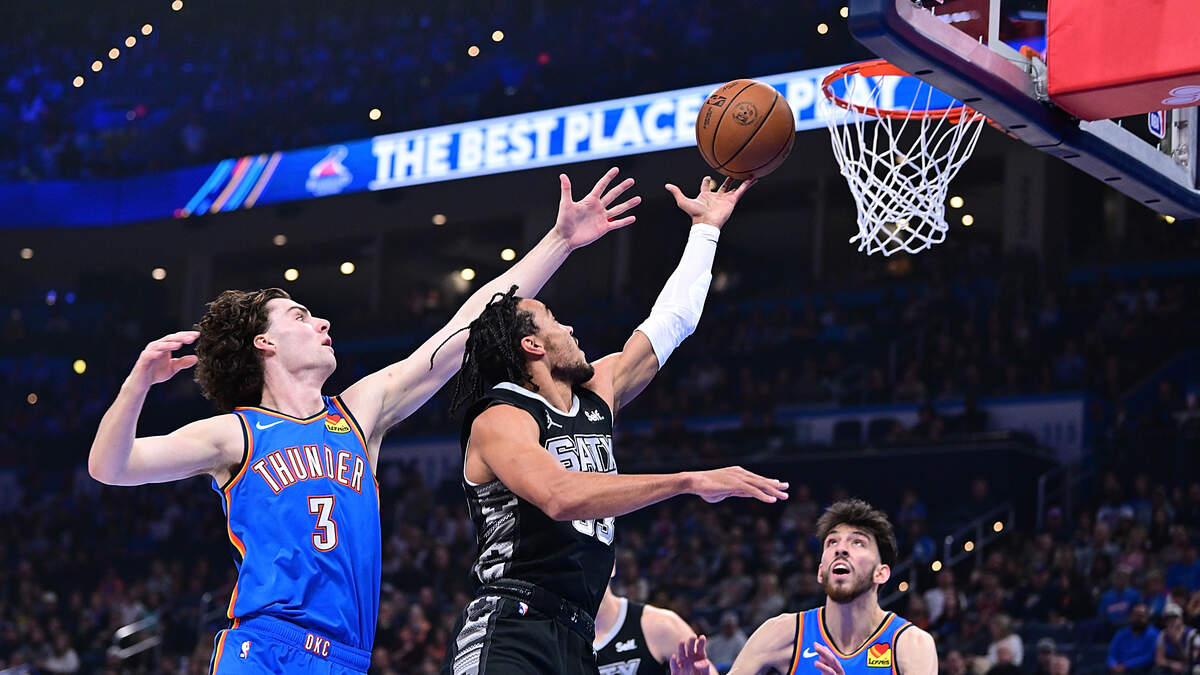 Tre Jones #33 of the San Antonio Spurs puts up a shot ahead of Josh Giddey #3 of the Oklahoma City Thunder during the first half at Paycom Center on April 10, 2024 in Oklahoma City, Oklahoma. Photo: Joshua Gateley / Getty Images Sport / Getty Images