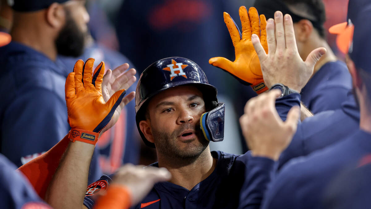 Jose Altuve #27 of the Houston Astros is congratulated by teammates after a solo home run in the third inning against the Texas Rangers at Minute Maid Park on April 14, 2024 in Houston, Texas.Photo: Tim Warner / Getty Images Sport / Getty Images