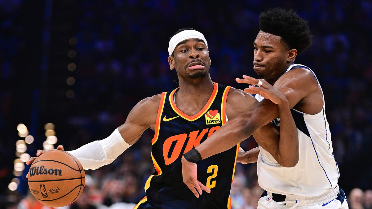 Shai Gilgeous-Alexander #2 of the Oklahoma City Thunder attempts to drive past Brandon Williams #00 of the Dallas Mavericks during the first half at Paycom Center on April 14, 2024 in Oklahoma City, Oklahoma.Photo: Joshua Gateley / Getty Images Sport / Getty Images