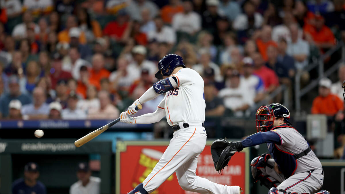 Alex Bregman #2 of the Houston Astros hits a RBI single in the first inning against the Atlanta Braves at Minute Maid Park on April 15, 2024 in Houston, Texas. Photo: Tim Warner / Getty Images Sport / Getty Images