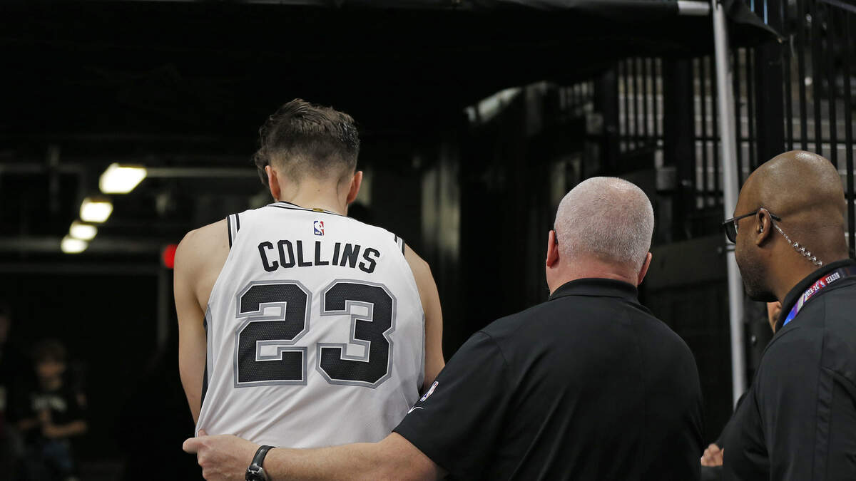 Zach Collins #23 of the San Antonio Spurs is led off the court with a possible dislocated shoulder in the second half of the game against the Detroit Pistons at Frost Bank Center on April 14, 2024 in San Antonio, Texas.Photo: Ronald Cortes / Getty Images Sport / Getty Images