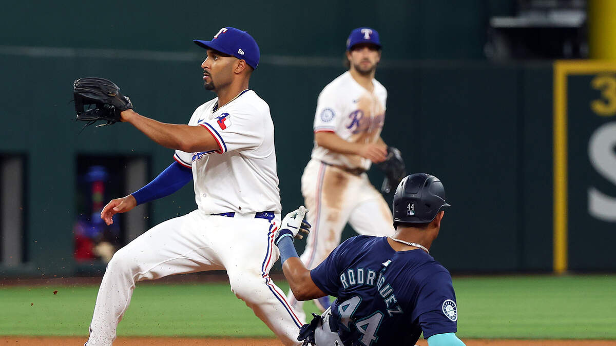 Julio Rodríguez #44 of the Seattle Mariners steals second as Marcus Semien #2 of the Texas Rangers waits for the ball in the fifth inning at Globe Life Field on April 25, 2024 in Arlington, Texas. Photo: Richard Rodriguez / Getty Images Sport / Getty Images