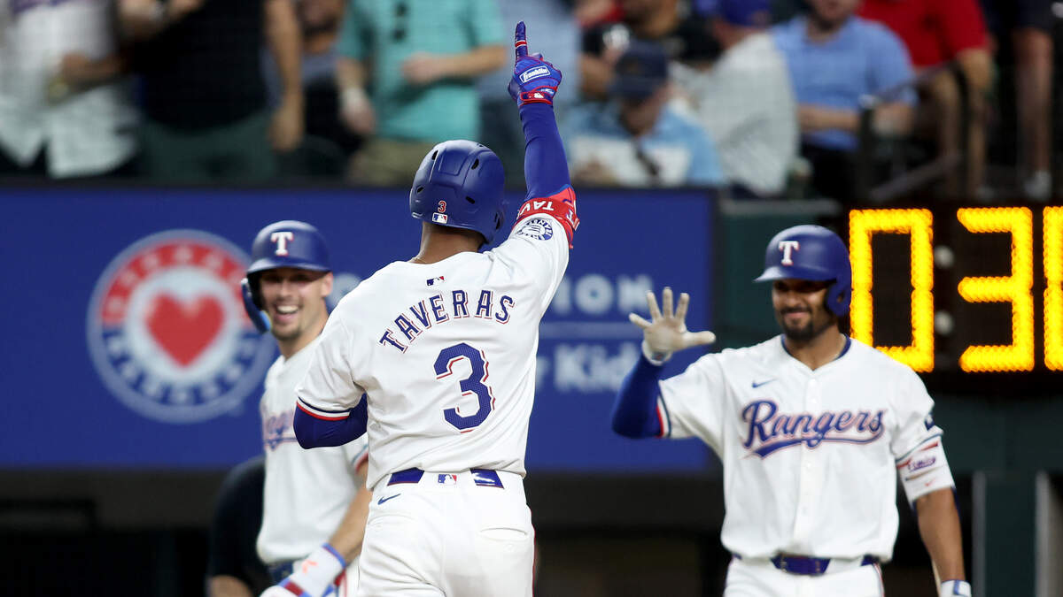 Leody Taveras #3 of the Texas Rangers celebrates his two-run home run against the Washington Nationals in the eighth inning at Globe Life Field on April 30, 2024 in Arlington, Texas. Photo: Tim Heitman / Getty Images Sport / Getty Images