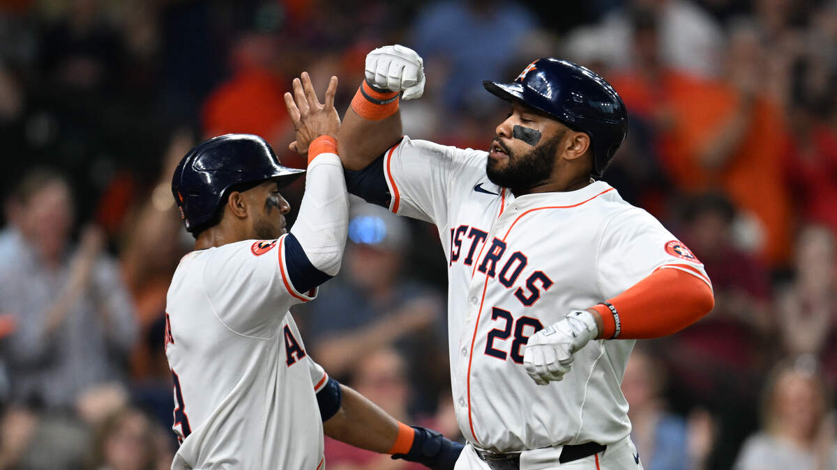Jon Singleton #28 of the Houston Astros celebrates his two-run home run with Jeremy Pena #3 during the seventh inning against the Seattle Mariners at Minute Maid Park on May 05, 2024 in Houston, Texas. Photo: Jack Gorman / Getty Images Sport / Getty Images