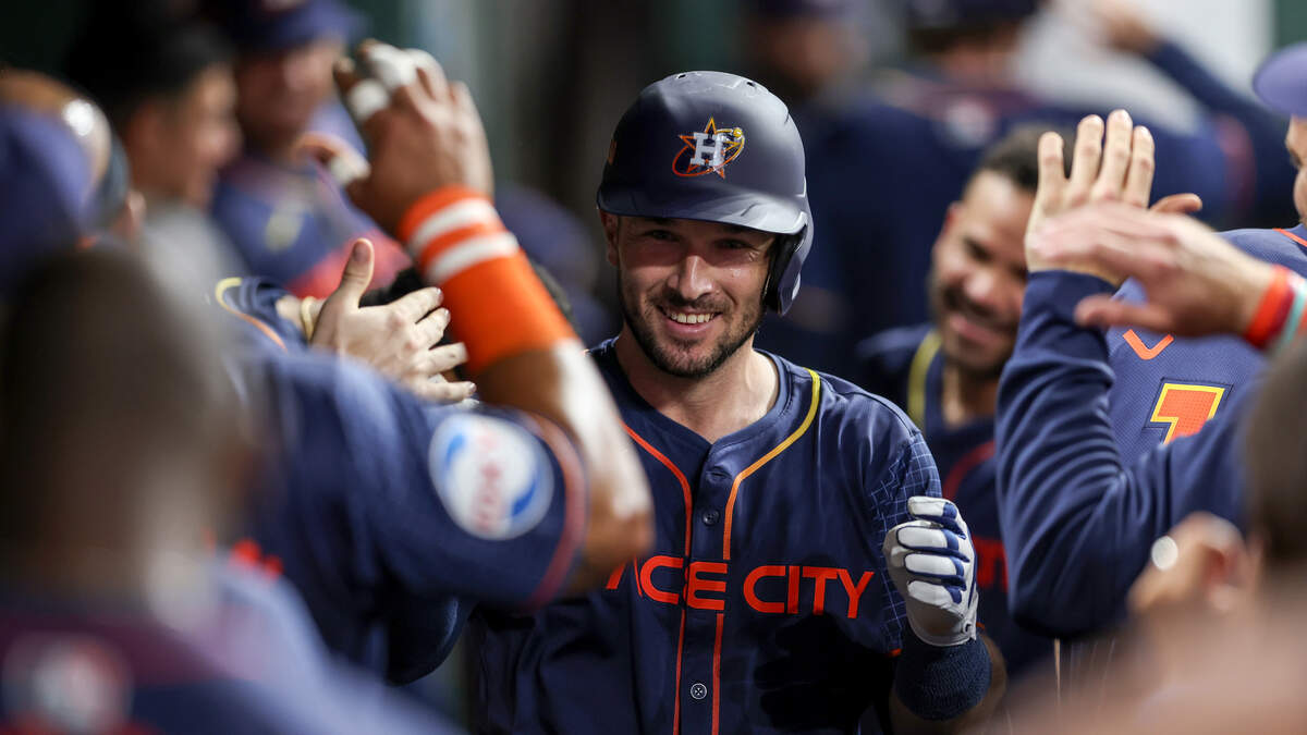 Alex Bregman #2 of the Houston Astros is congratulated by teammates after a solo home run in the fourth inning against the Oakland Athletics at Minute Maid Park on May 13, 2024 in Houston, Texas. Photo: Tim Warner / Getty Images Sport / Getty Images
