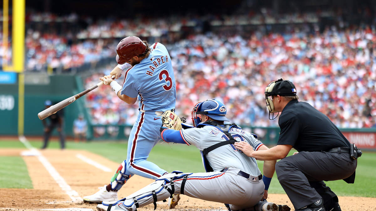 Bryce Harper #3 of the Philadelphia Phillies hits a single during the fourth inning against the Texas Rangers at Citizens Bank Park on May 23, 2024 in Philadelphia, Pennsylvania.Photo: Tim Nwachukwu / Getty Images Sport / Getty Images