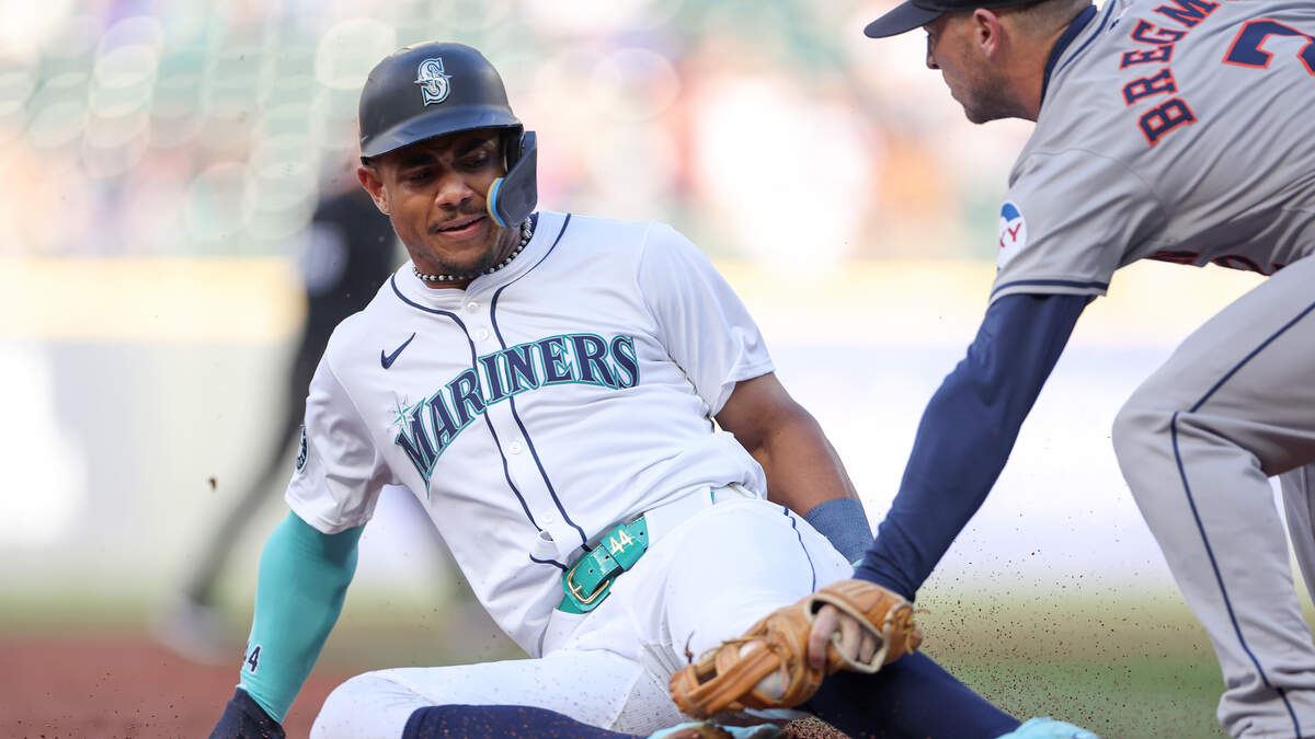Alex Bregman #2 of the Houston Astros tags Julio Rodríguez #44 of the Seattle Mariners out at third base during the first inning at T-Mobile Park on May 28, 2024 in Seattle, Washington. Photo: Steph Chambers / Getty Images Sport / Getty Images
