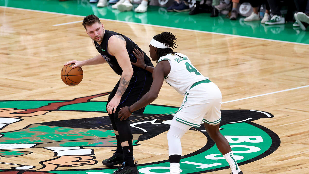 Luka Doncic #77 of the Dallas Mavericks drives to the basket against Jrue Holiday #4 of the Boston Celtics during the fourth quarter in Game One of the 2024 NBA Finals at TD Garden on June 06, 2024 in Boston, Massachusetts. Photo: Adam Glanzman / Getty Images Sport / Getty Images