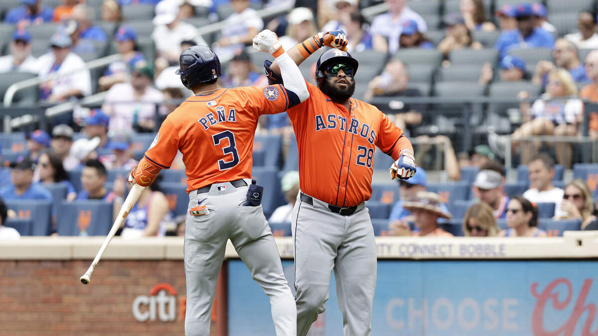 Jon Singleton #28 of the Houston Astros celebrates his second inning home run against the New York Mets with teammate Jeremy Pena #3 at Citi Field on June 30, 2024 in New York City. Photo: Jim McIsaac / Getty Images Sport / Getty Images