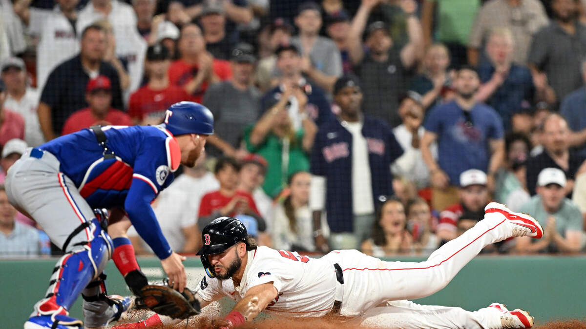 Wilyer Abreu #52 of the Boston Red Sox slides safely into home plate against Carson Kelly #18 of the Texas Rangers during the eighth inning at Fenway Park on August 13, 2024 in Boston, Massachusetts. Photo: Brian Fluharty / Getty Images Sport / Getty Images