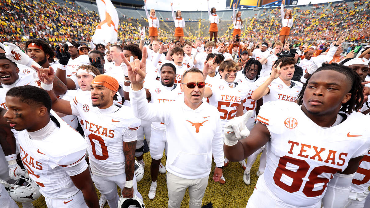 Head coach Steve Sarkisian of the Texas Longhorns celebrates with his team after a 31-12 victory against the Michigan Wolverines at Michigan Stadium on September 07, 2024 in Ann Arbor, Michigan. Photo: Gregory Shamus / Getty Images Sport / Getty Images