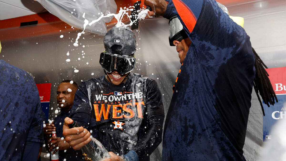 Jeremy Pena #3 and Framber Valdez #59 of the Houston Astros celebrate in the locker room after winning the AL West Division by defeating the Seattle Mariners at Minute Maid Park on September 24, 2024 in Houston, Texas. Photo: Tim Warner / Getty Images Sport / Getty Images