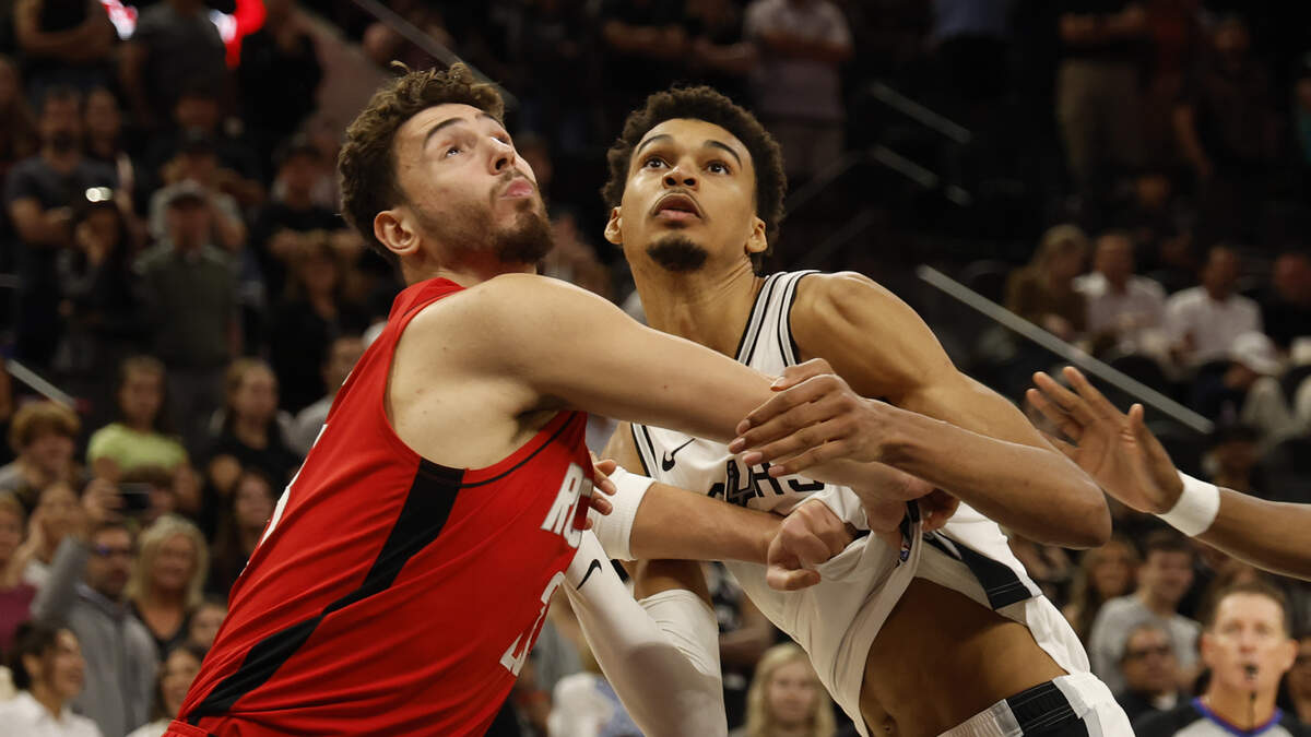 Victor Wembanyama #1 of the San Antonio Spurs battles Alperen Sengun #28 of the Houston Rockets for rebounding position in the second half at Frost Bank Center on October 26, 2024 in San Antonio, Texas.Photo: Ronald Cortes / Getty Images Sport / Getty Images