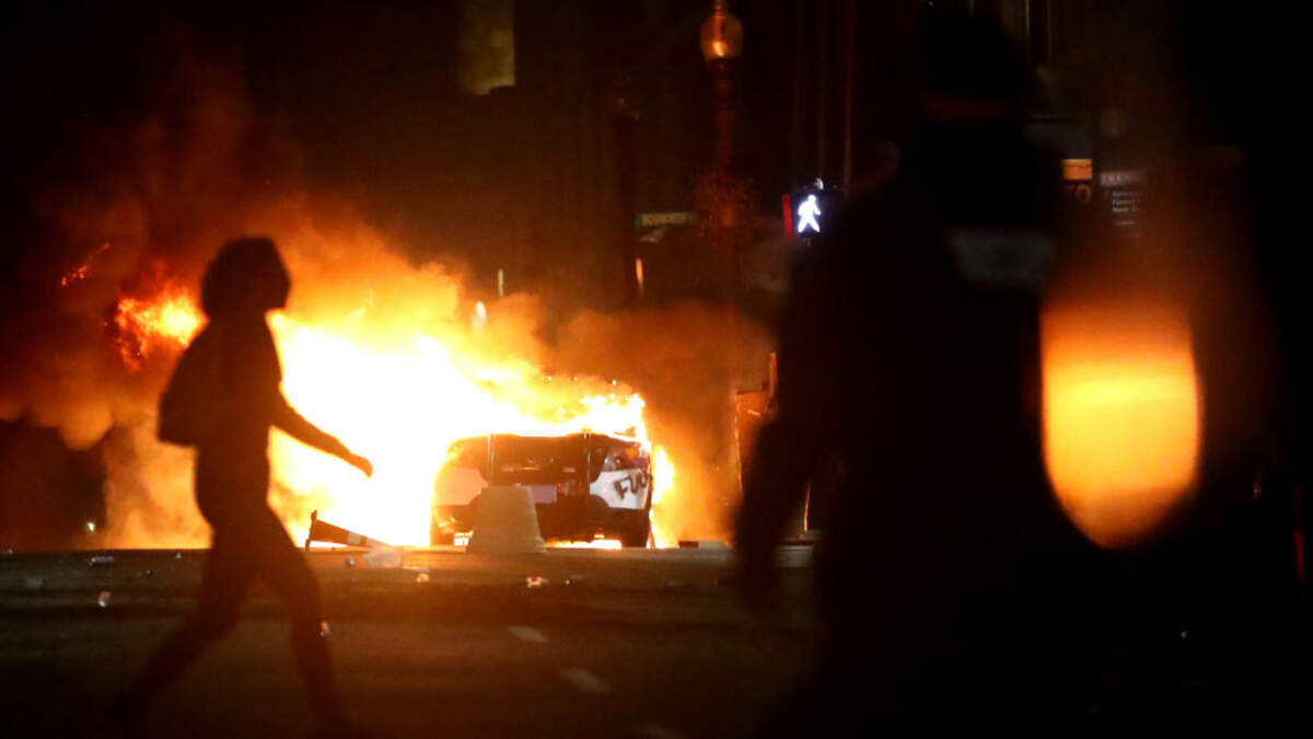 Photo: BOSTON, MASSACHUSETTS - MAY 31: A demonstrator walks in front of a Police car that has been lit on fire in response to the recent death of George Floyd on May 31, 2020 in Boston, Massachusetts. Protests spread across cities in the U.S., and in other parts of the world in response to the death of African American George Floyd while in police custody in Minneapolis, Minnesota. (Photo by Maddie Meyer/Getty Images)